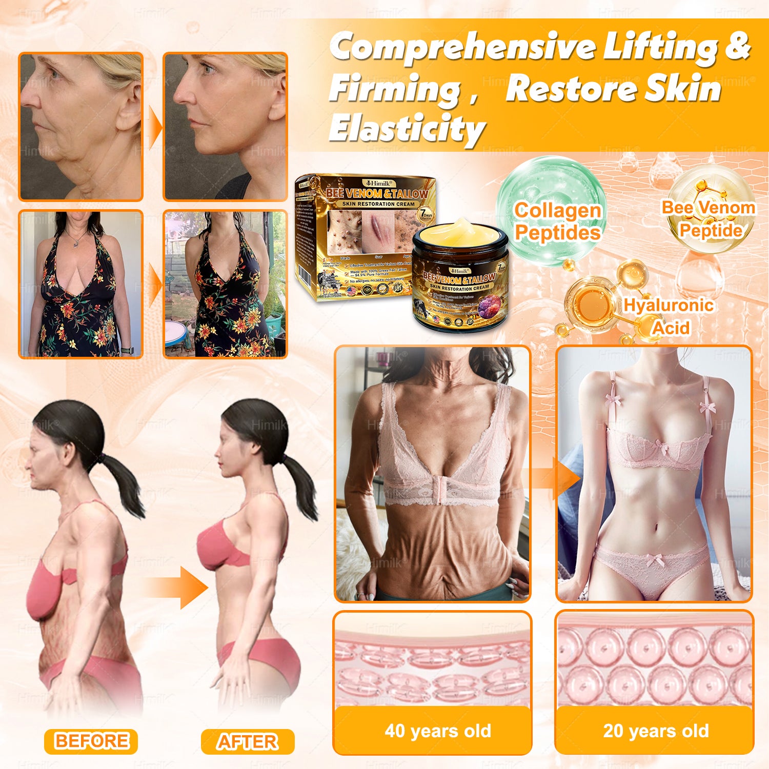As we age, our skin naturally loses collagen, causing areas like the chest and buttocks to become less firm and elastic. Collagen peptides rebuild the skinโs structure, while bee venom peptides stimulate new collagen formation. Hyaluronic acid provides deep hydration and grass-fed tallow nourishes and restores suppleness. With regular use, 95% of users noticed a visible lift and reduced sagging around the chest and buttocks. It also tightens loose skin after weight loss or childbirth and smooths fine lines for a firmer, younger look.